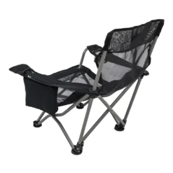 The 420D polyester honeycomb ripstop fabric surrounds a nylon mesh center fabric to deliver a 250-lb. weight capacity. The mesh center panel ensures airflow to prevent sweat buildup and to keep campers cool on those sweltering summer nights. The compact foldable design comes courtesy of all-aluminum frame construction. The mesh carry bag features clips that secure the bag to the front of the chair frame, allowing it to serve as an accessory pouch.