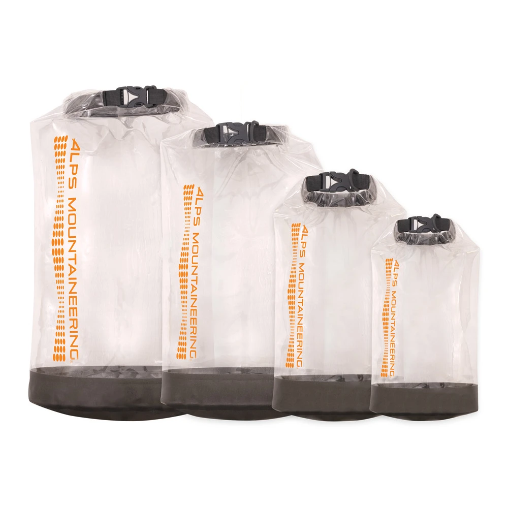 The ALPS Mountaineering Clear Passage Series offers abrasion-resistant mid-weight dry bags constructed of durable waterproof TPU material and 420D nylon TPU coated bottom, with fully welded seams. The bag’s superior construction, along with a secure roll-top closure, locks out water and offers a tenacious water barrier in wet environments. An oval-shaped, flat bottom helps the bags stand up on their own and make them easy to fill. A D-ring attachment point is included for additional gear lashing, stacking, or attachment to your watercraft. The most adventurous can’t go wrong with the Clear Passage Series. Offered are capacities to fit your needs: 5L, 10L, 20L, and 35L.